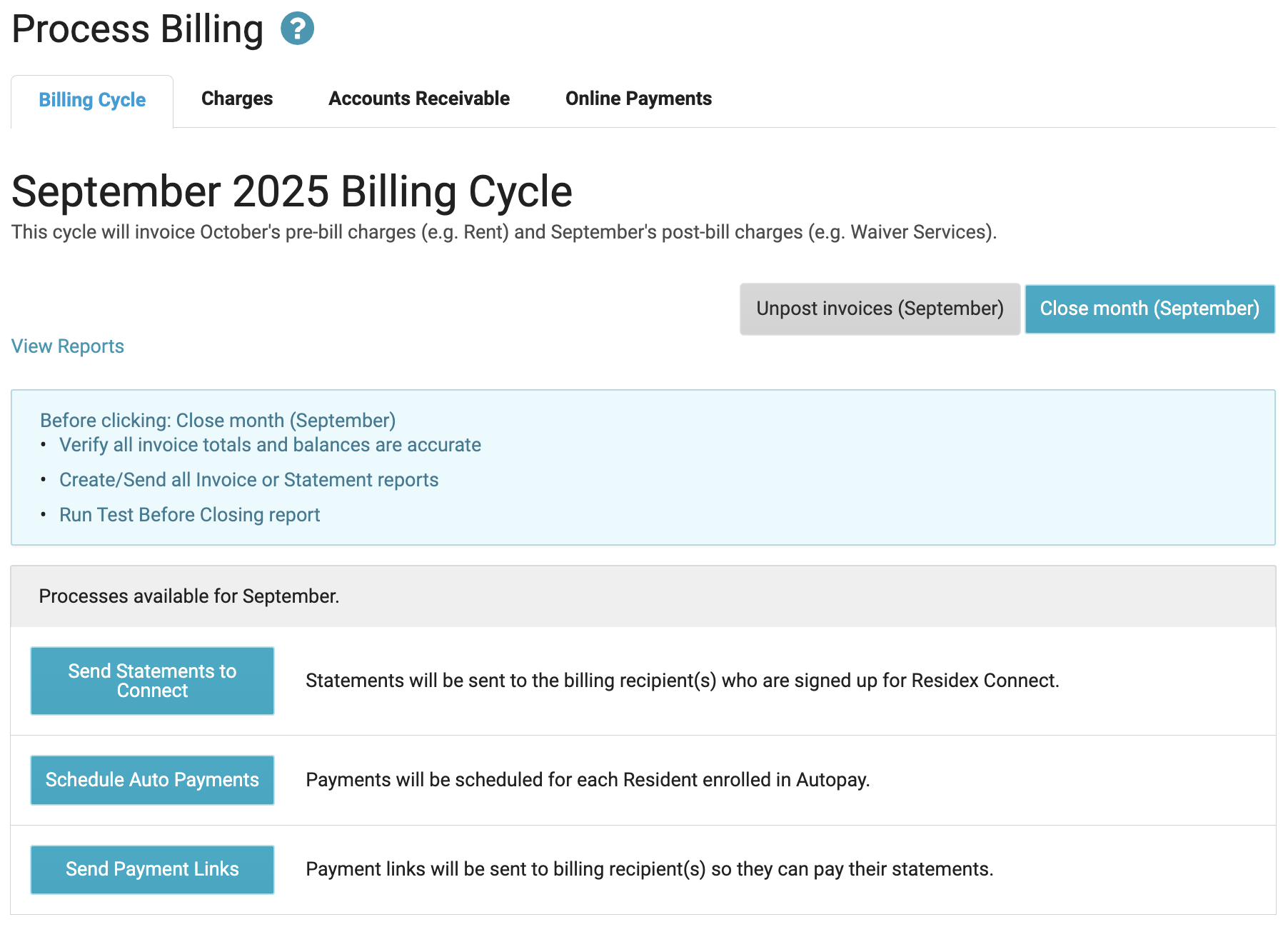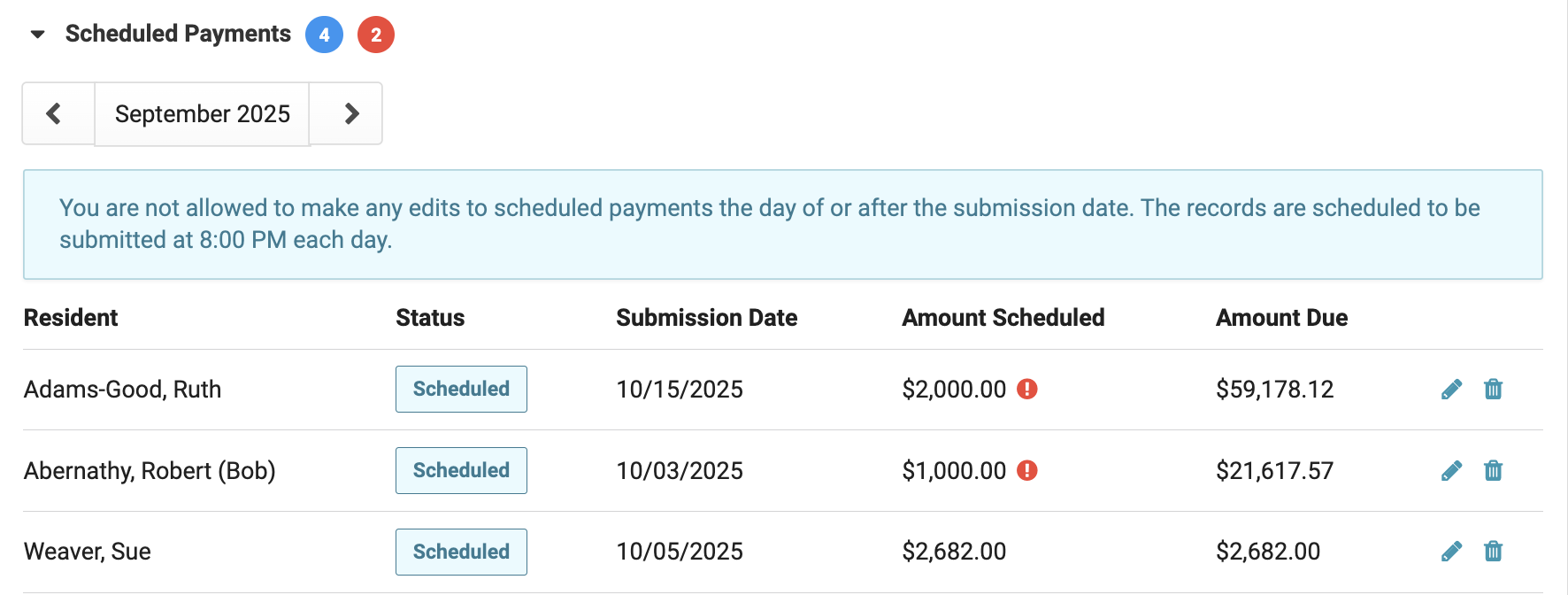 During monthly billing, navigate to Billing > Process Billing> Schedule Auto Payments to queue payments for withdrawal on their specified submission dates. After scheduling, you can modify payment amounts or cancel autopay transactions up until 11:59pm the night before the scheduled withdrawal date.