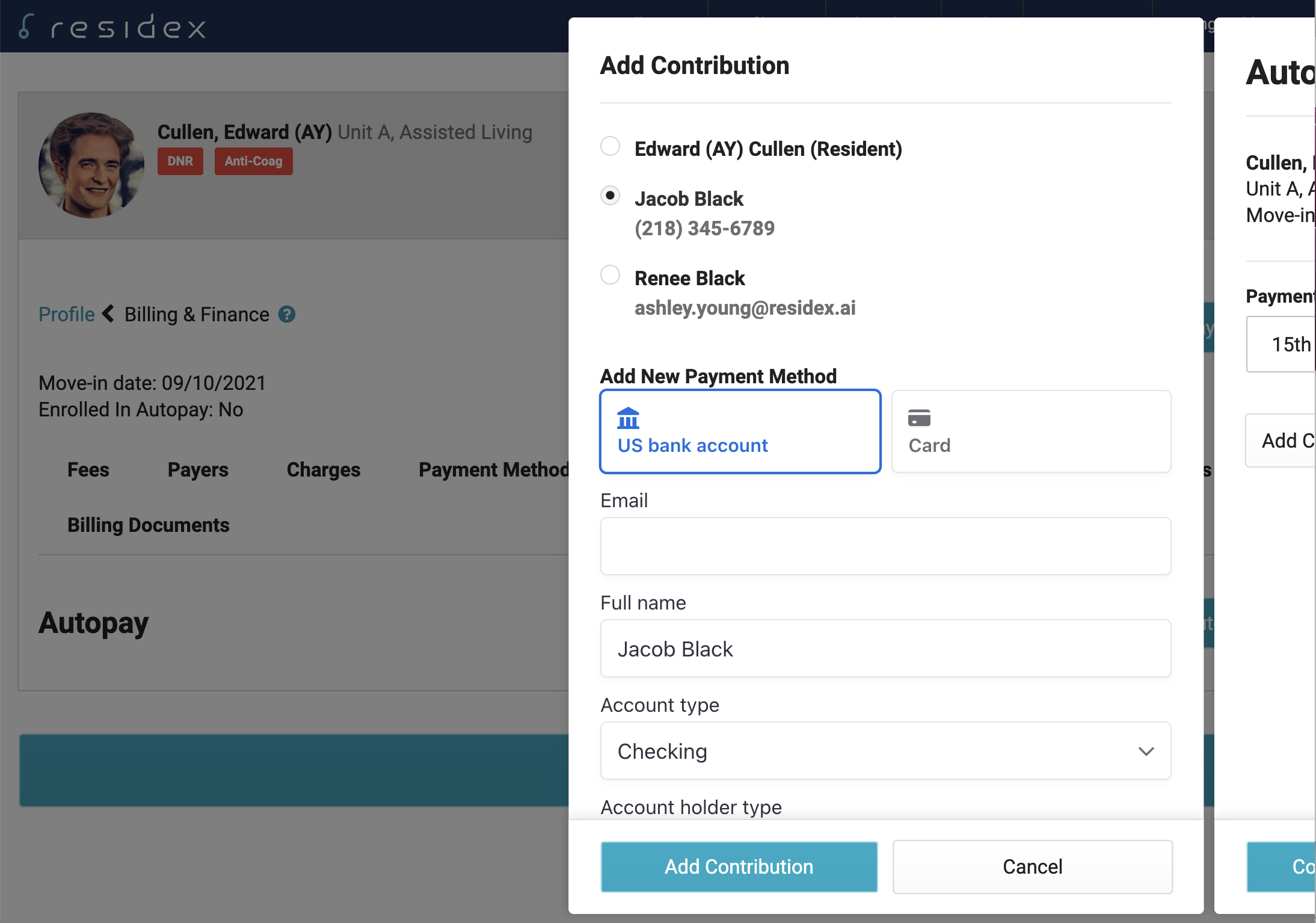 The contribution list will show the name of the Resident in addition to any billing contacts as options to choose from. Select to whom the owner of the account is being enrolled for and select Add New Payment Method.