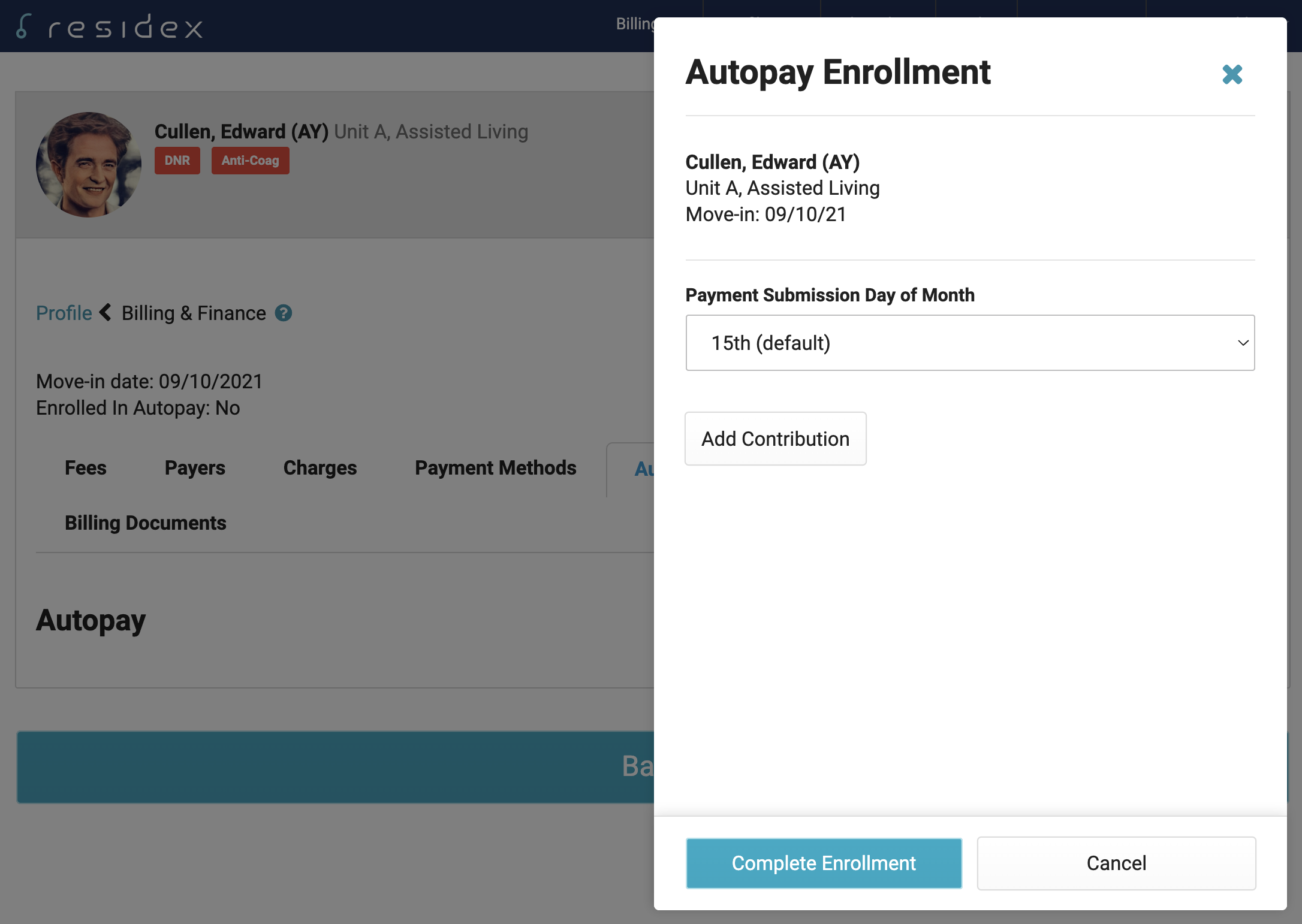 To set up autopay, navigate to Profiles > Residents > Select a resident > Billing & Finance > Autopay> Enroll in Autopay.