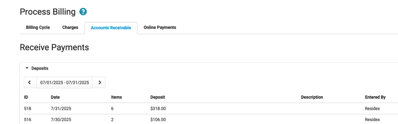 Processed payments will show as deposits entered by Residex on the Accounts Receivable tab.