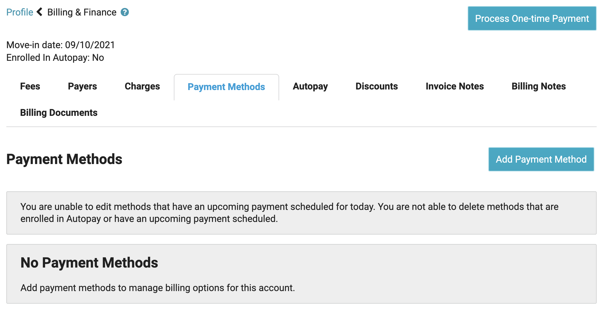 To add a new payment method, delete an existing method or edit an expiration date, navigate to Profiles > Residents > Select a resident > Billing & Finance > Payment Methods.