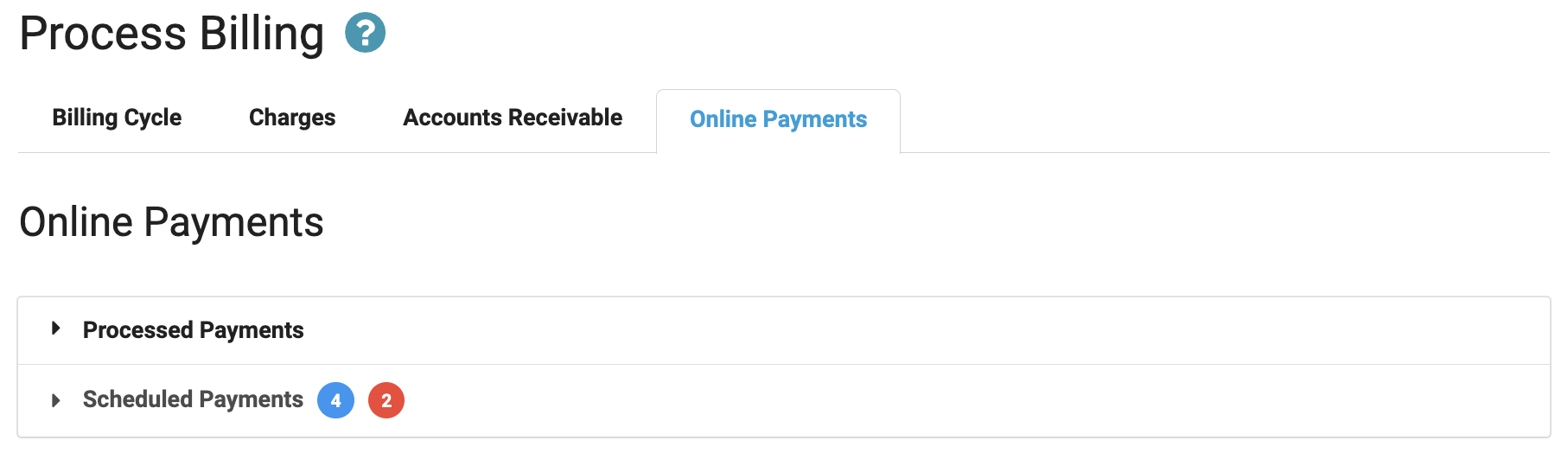To view processed payments or make adjustments to a scheduled payment, navigate to Billing > Process Billing > Online Payments