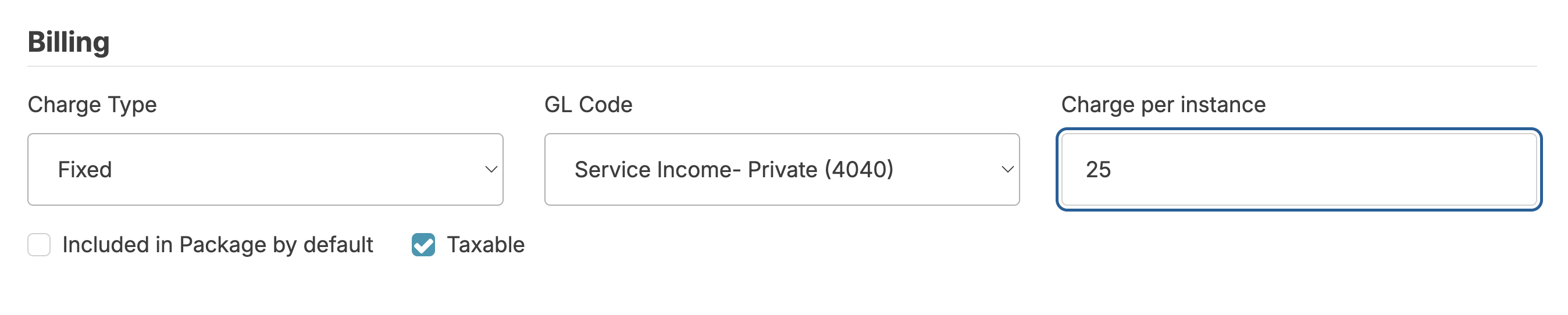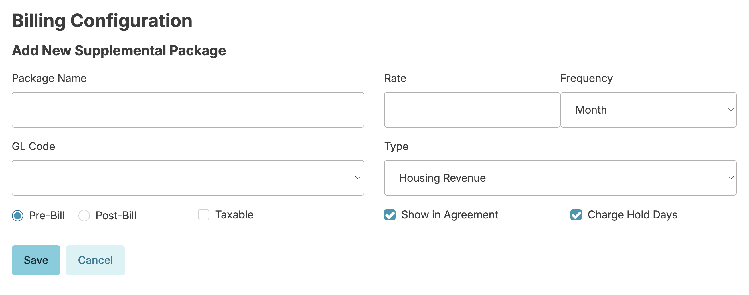• Package NameRate, and Frequency (determines how monthly charges are calculated), and GL Code (if your home does not use GL codes, you can use a catch-all) are required.