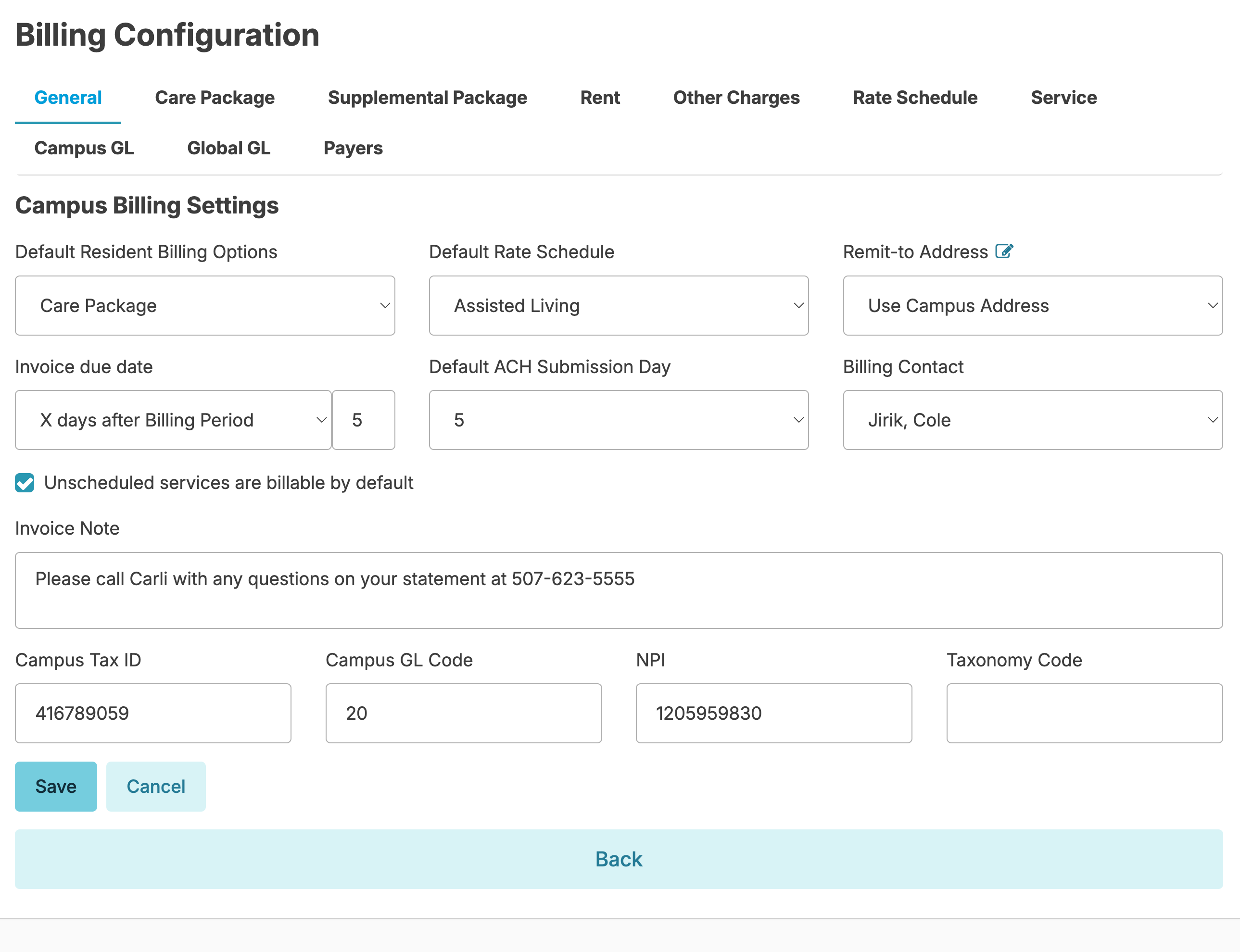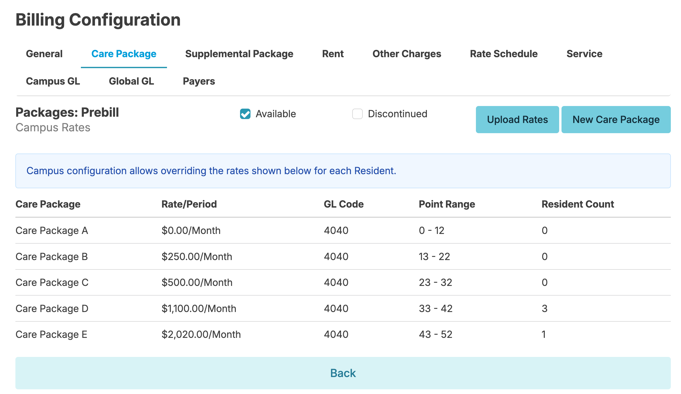 Billing Options can be configured to meet your organization's specific needs and preferences. Once billing is configured for your campus, you will be able to set up individual residents' rates from their Profile screen.