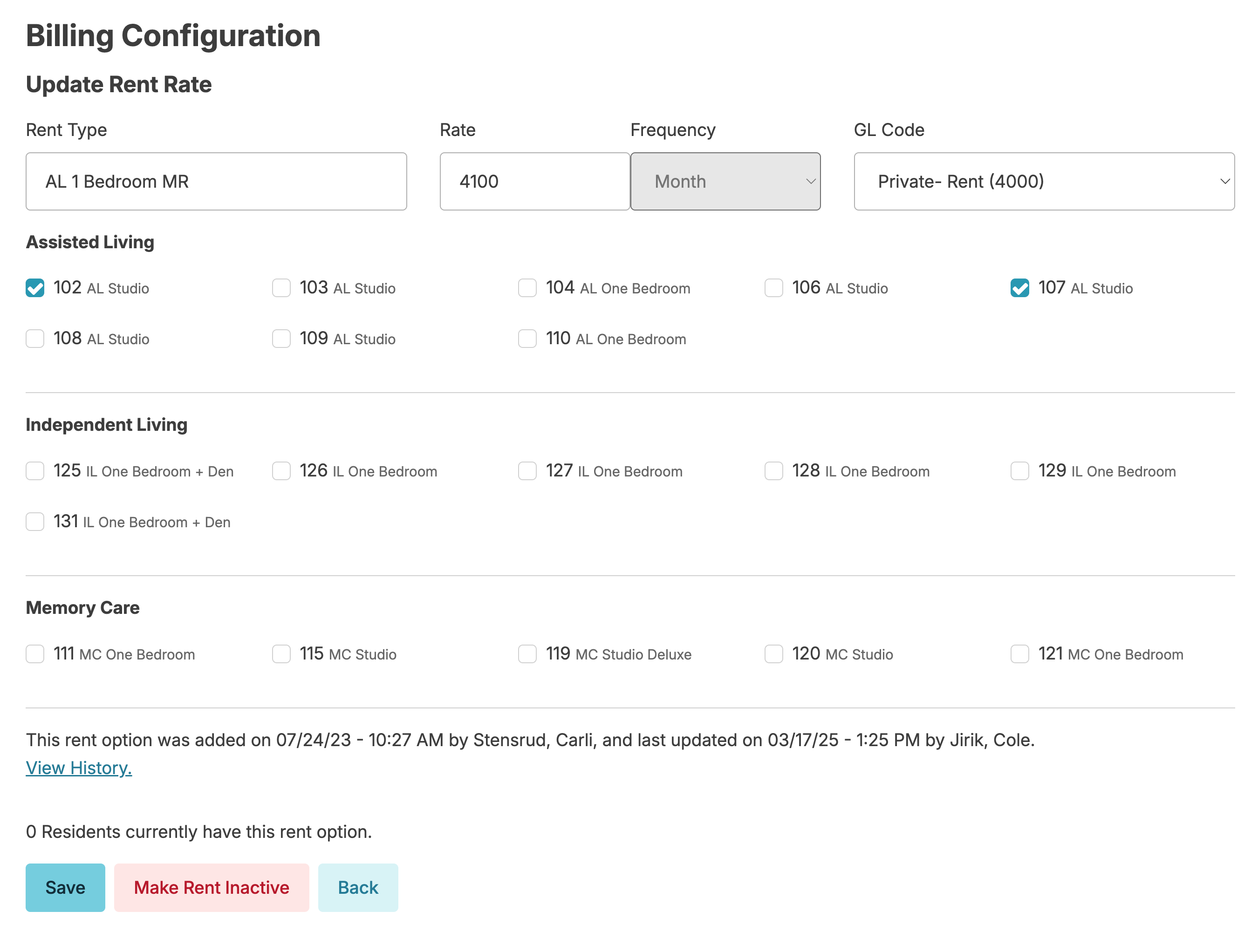 Click on any rent to view (when it was created, last updated, which units the rent is for, and to which residents at your campus) or edit its details. If the rent type is not in use by any Residents you can make that rent Inactive.
