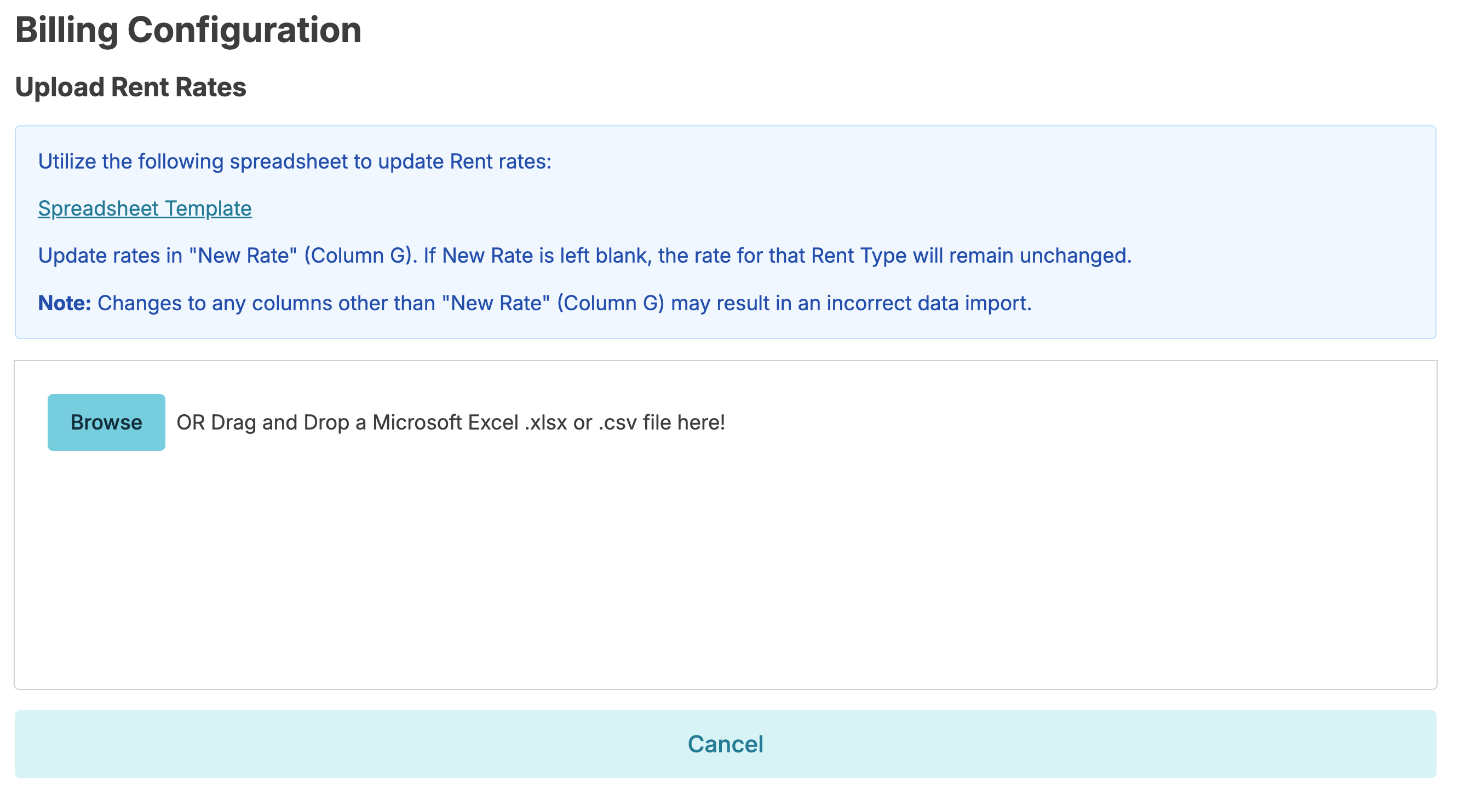 Users with Billing Manager (Role 28) also have the option to update multiple Rent rates at once. This can quickly be done by downloading the provided spreadsheet template, entering the new rates, and uploading the file back into Residex. Once the file has been uploaded, you will have a chance to review for errors and make any necessary changes before saving. Please note that this process can only be used to updating existing Rents and can not be used to add new Rents.