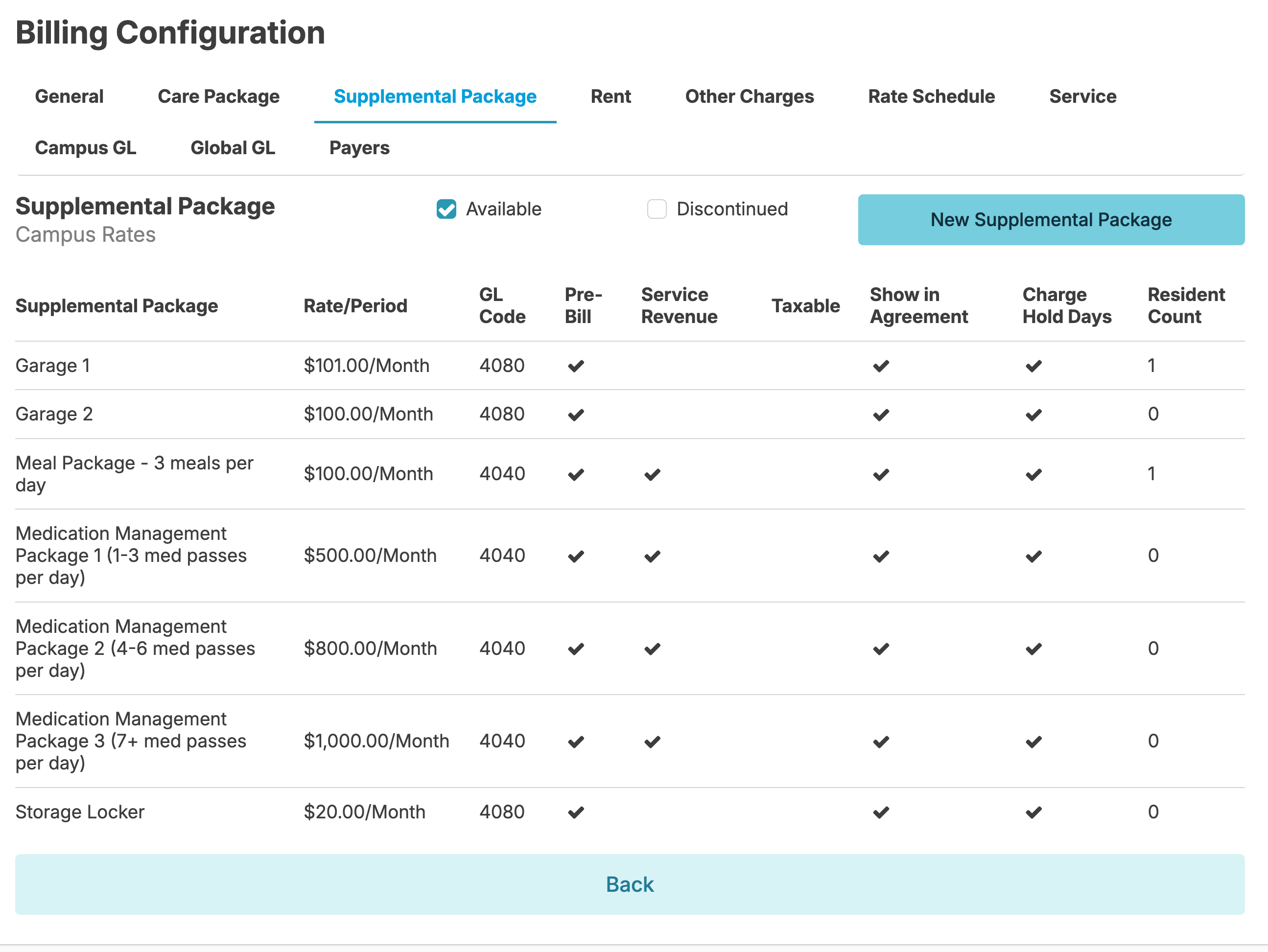 • Rates for supplemental packages can be calculated on a daily or monthly frequency based on your preferences. This will result in a single supplemental charge added to a resident's invoice calculated based on a daily rate or a flat monthly rate.