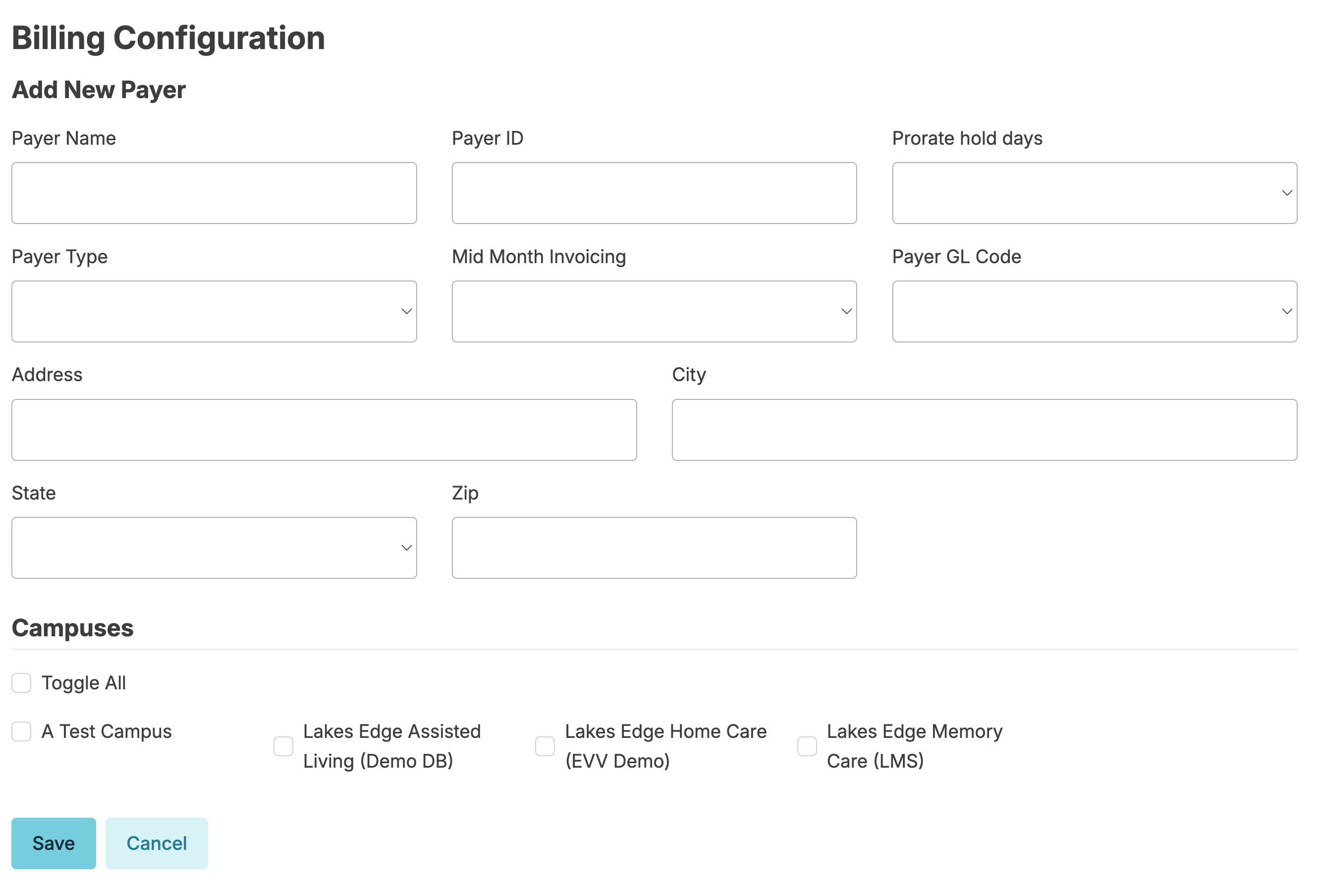 • Click New Payer to add a new payer. Complete the fields and select which campus the payer should be available for.