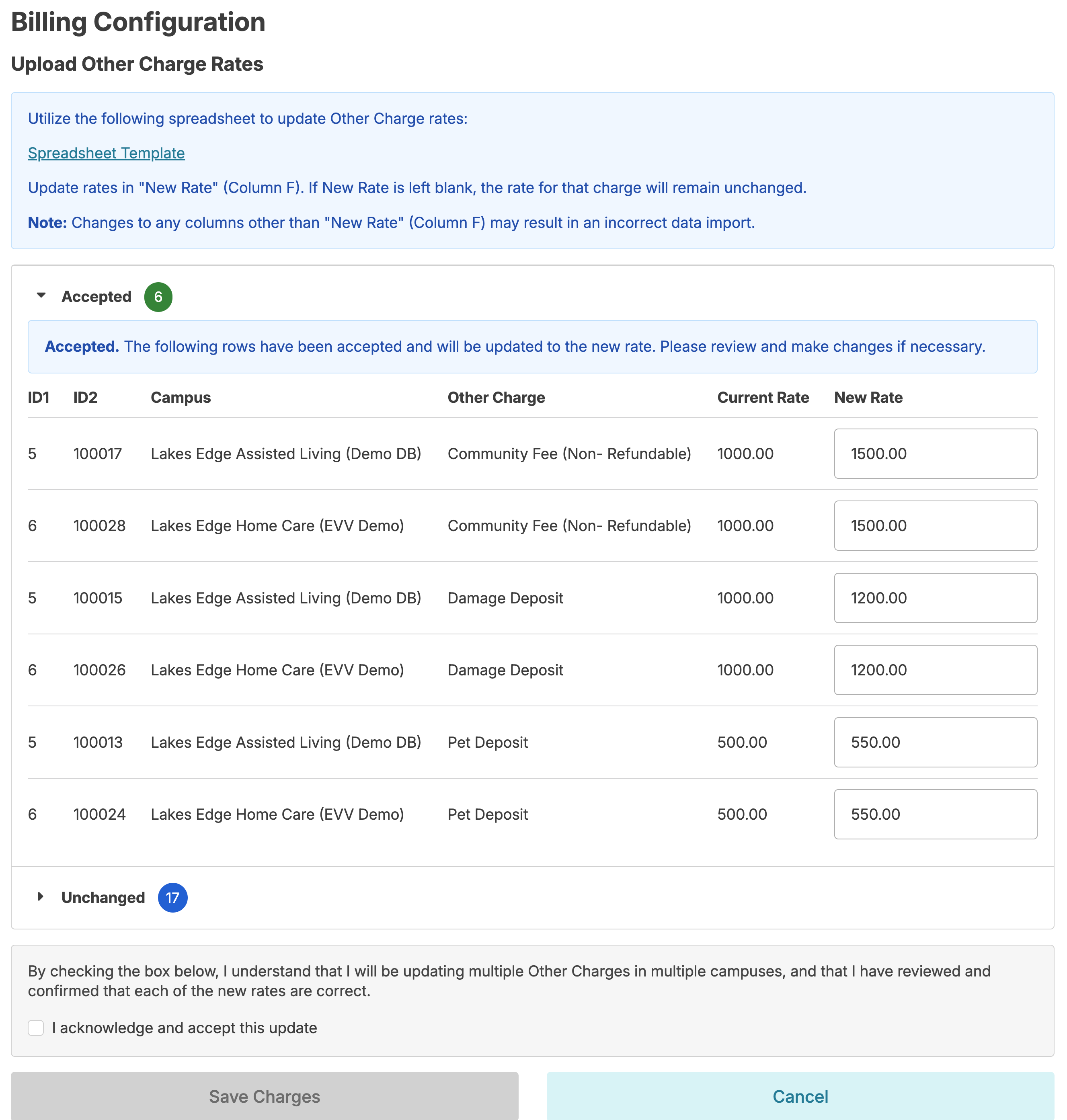 Users with Billing Manager (Role 28) also have the option to update multiple Other Charge rates at once. This can quickly be done by downloading the provided spreadsheet template, entering the new rates, and uploading the file back into Residex. Once the file has been uploaded, you will have a chance to review for errors and make any necessary changes before saving. Please note that this process can only be used to updating existing Other Charges and can not be used to add new Other Charges.