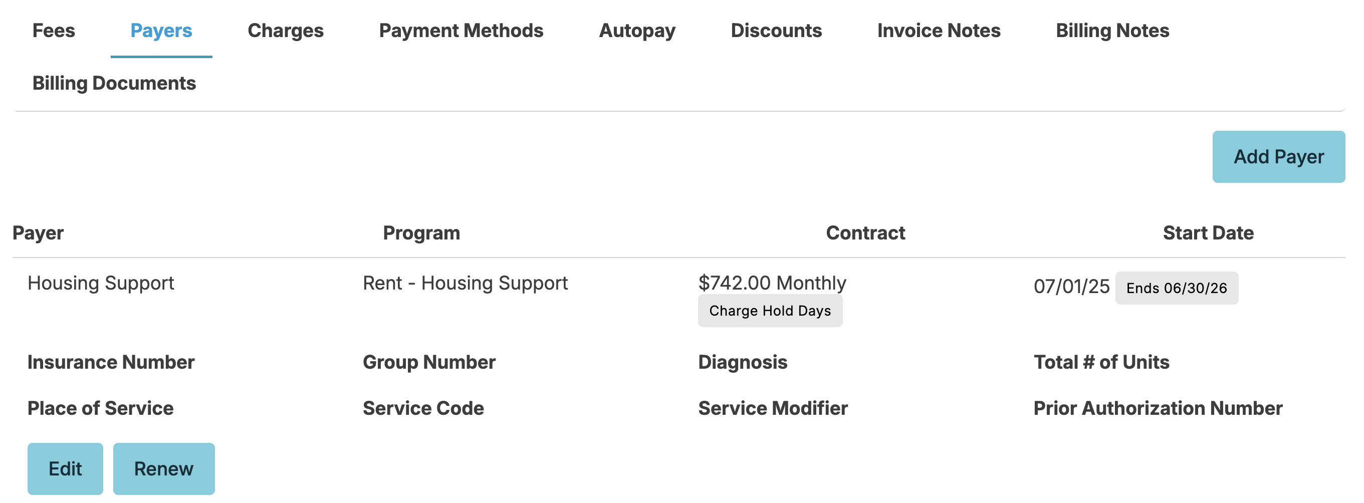 To manage Payers, go to the resident profile > Billing & Finance > Payers tab.
