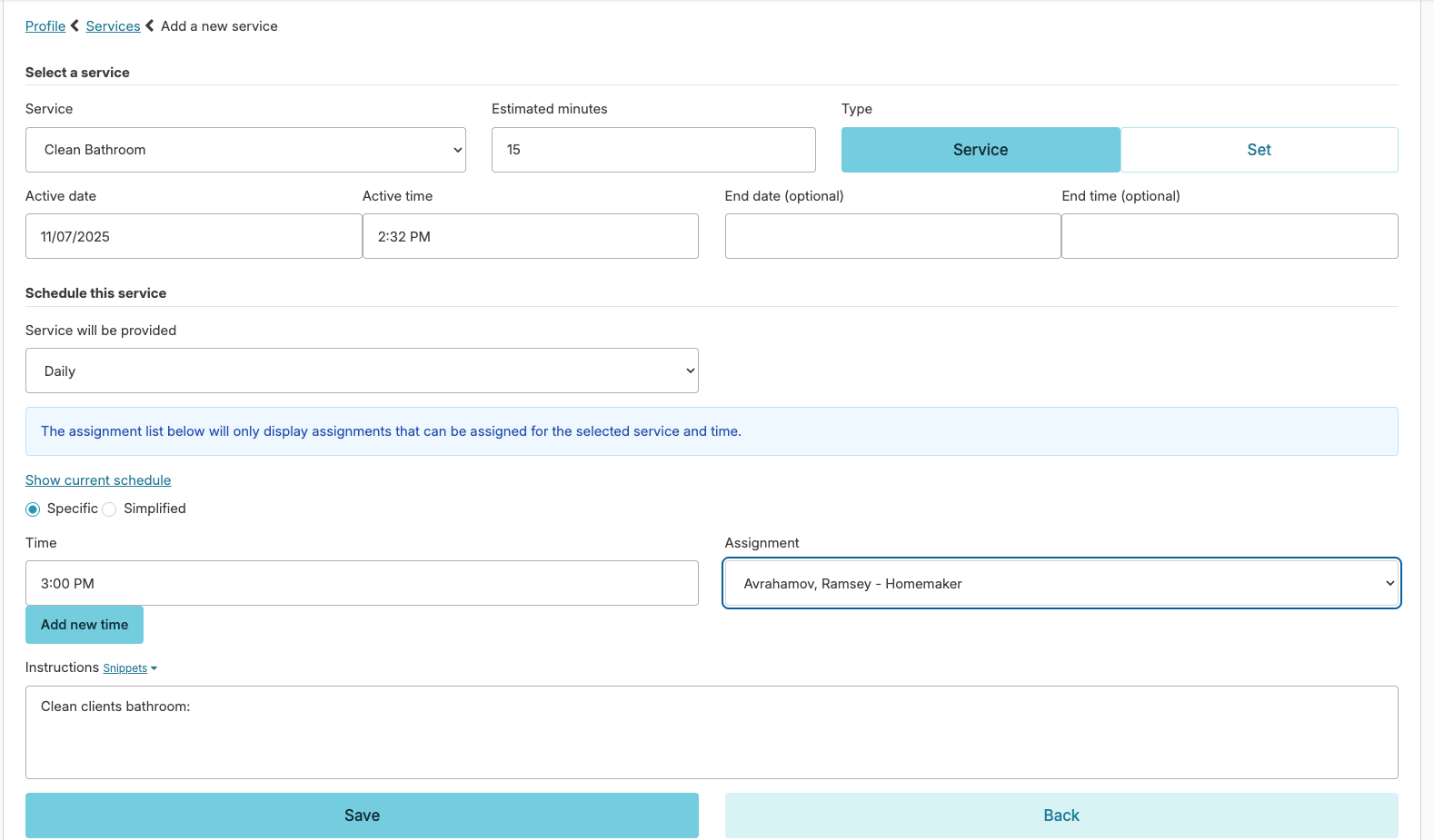 • We recommend being specific when adding services – if a client gets bathroom assistance, add that specific service