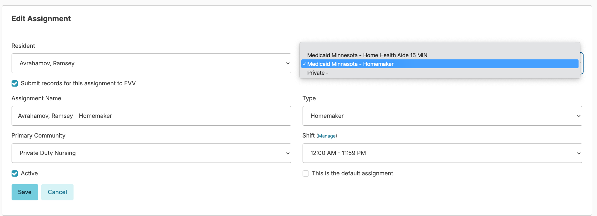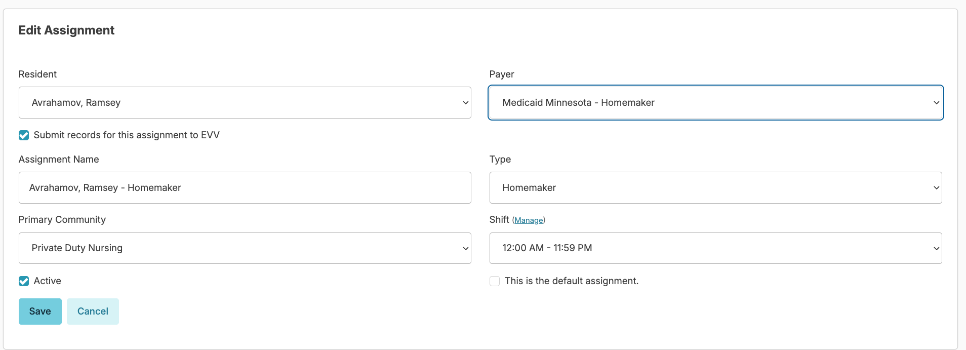 • If EVV is turned on, the check box for “Submit records for this assignment to EVV” will automatically be checked