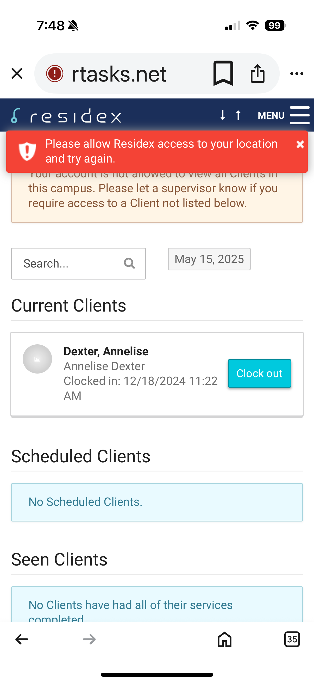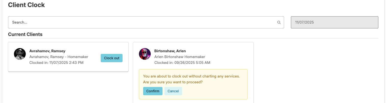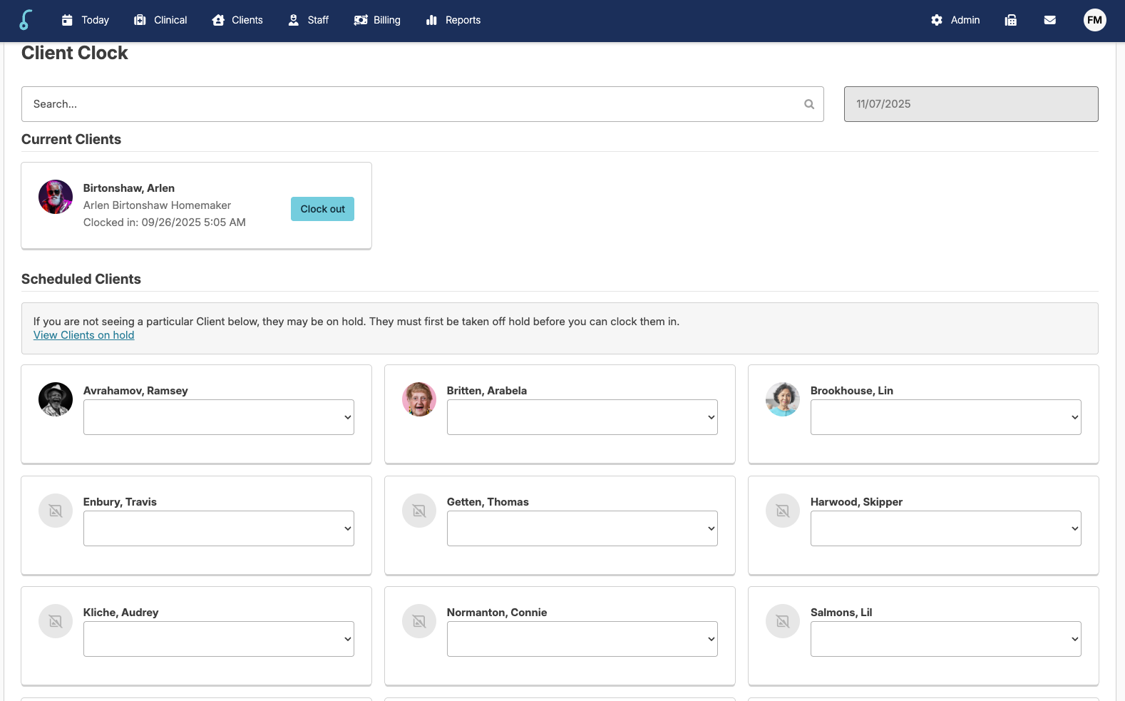 - Current Clients: Clients you (the user) has already clocked in
