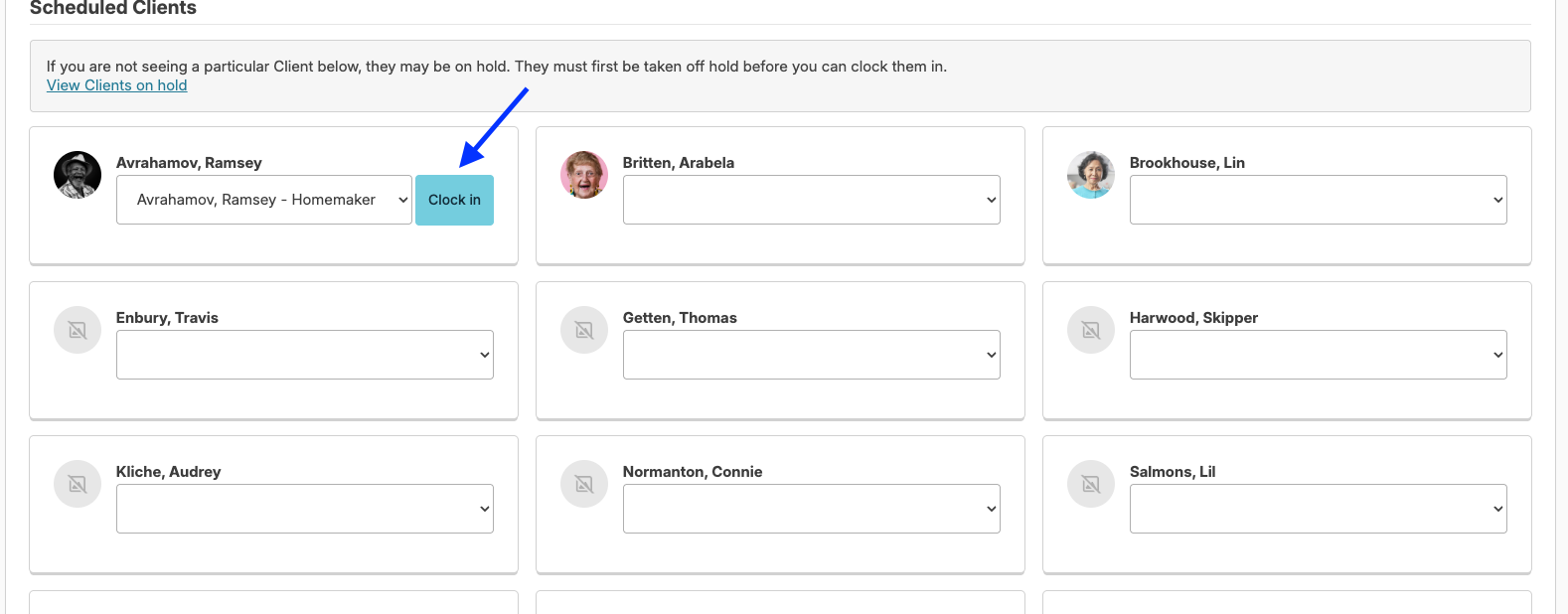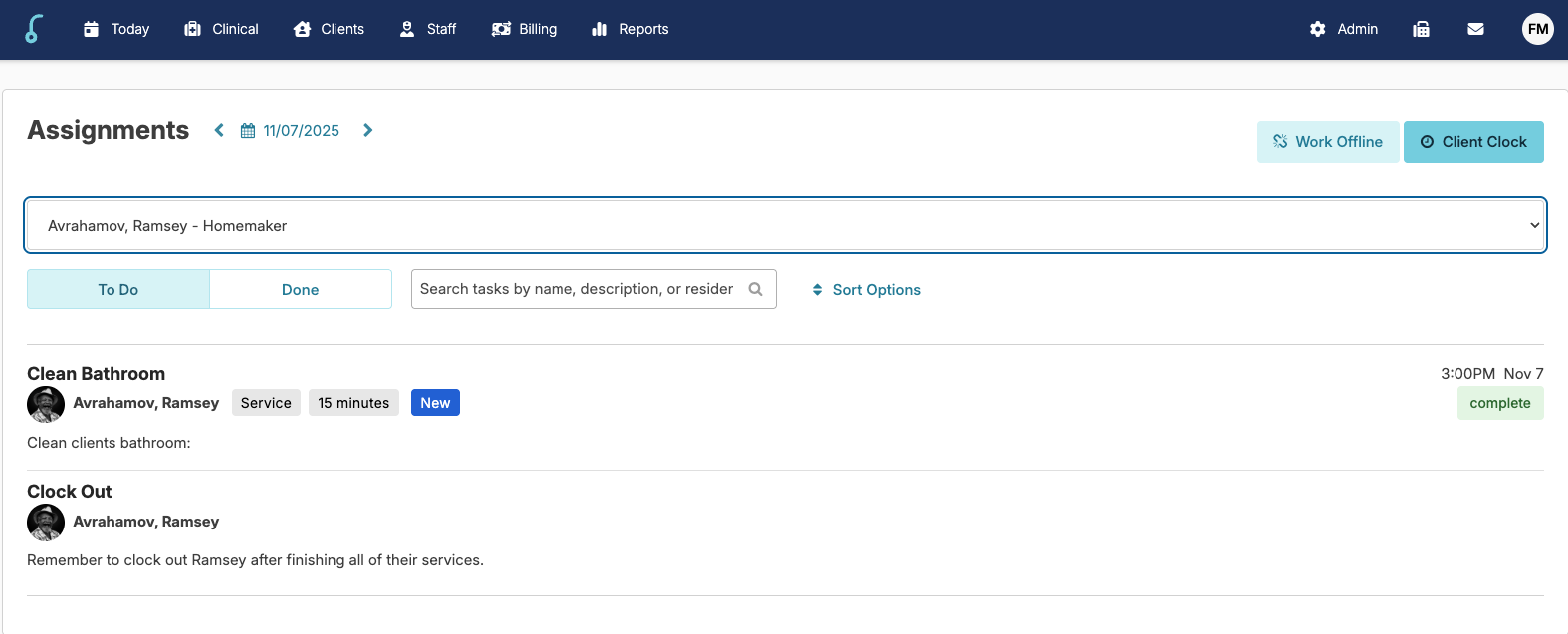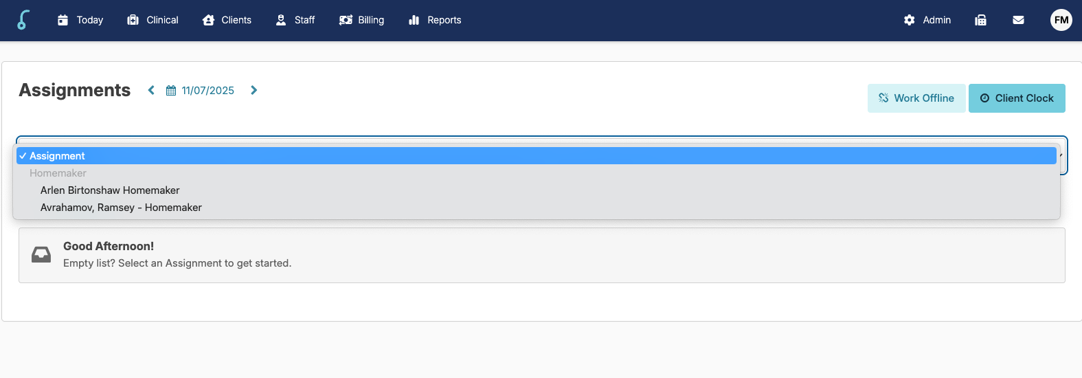 - Scheduled Clients: Clients with scheduled services for the day will have a drop-down selection for the appropriate assignments associated with the client.