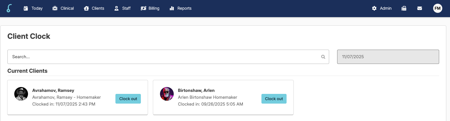 Once selected, it will automatically bring you to the Today > Client Clock screen where you can Clock out the current client.