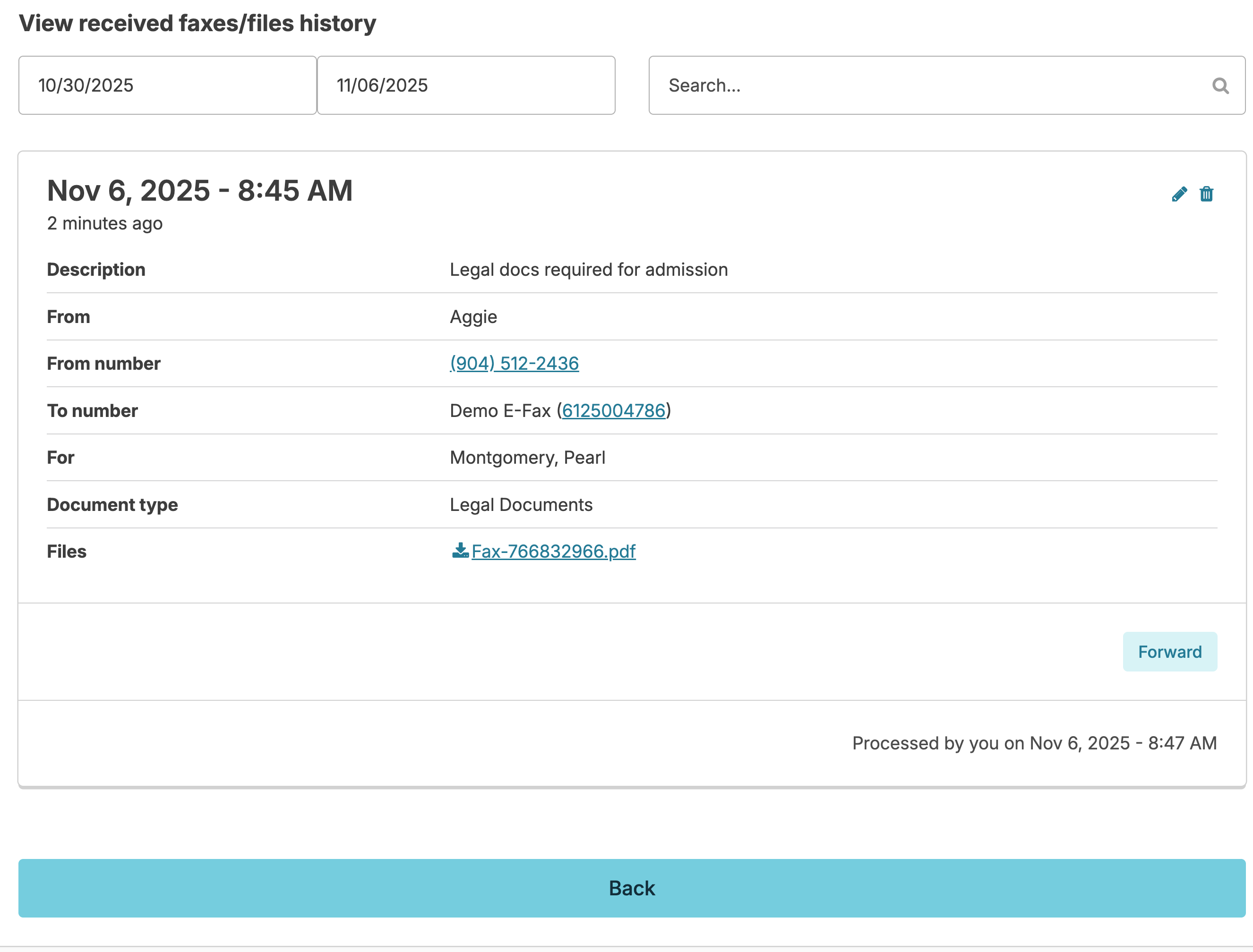 Processed faxes located in history can be forwarded to another number if needed by clicking the Forward button in the lower right-hand corner.