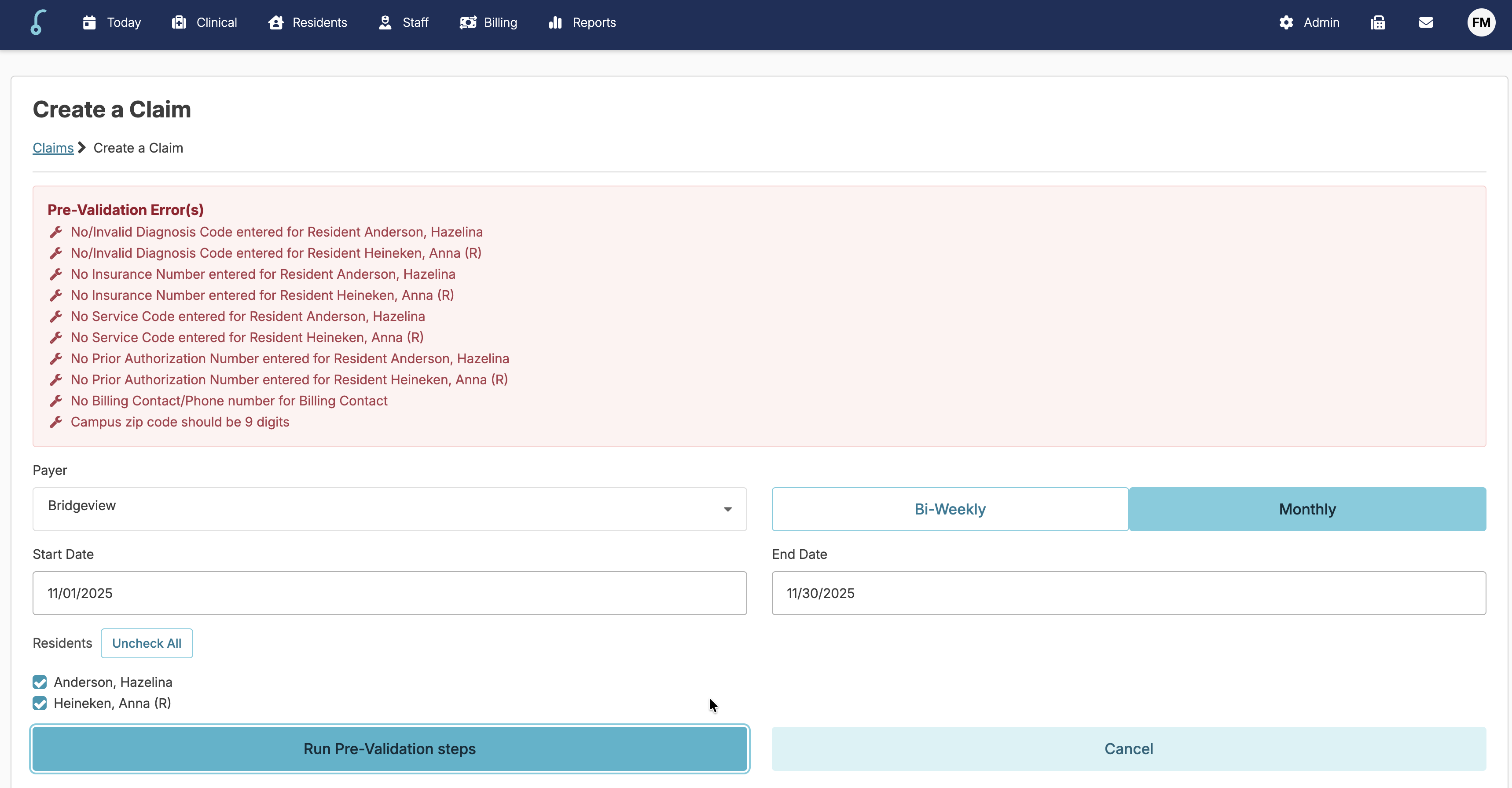 The pre-validation step reviews all residents (selected) in the batch and checks for discrepancies between:
