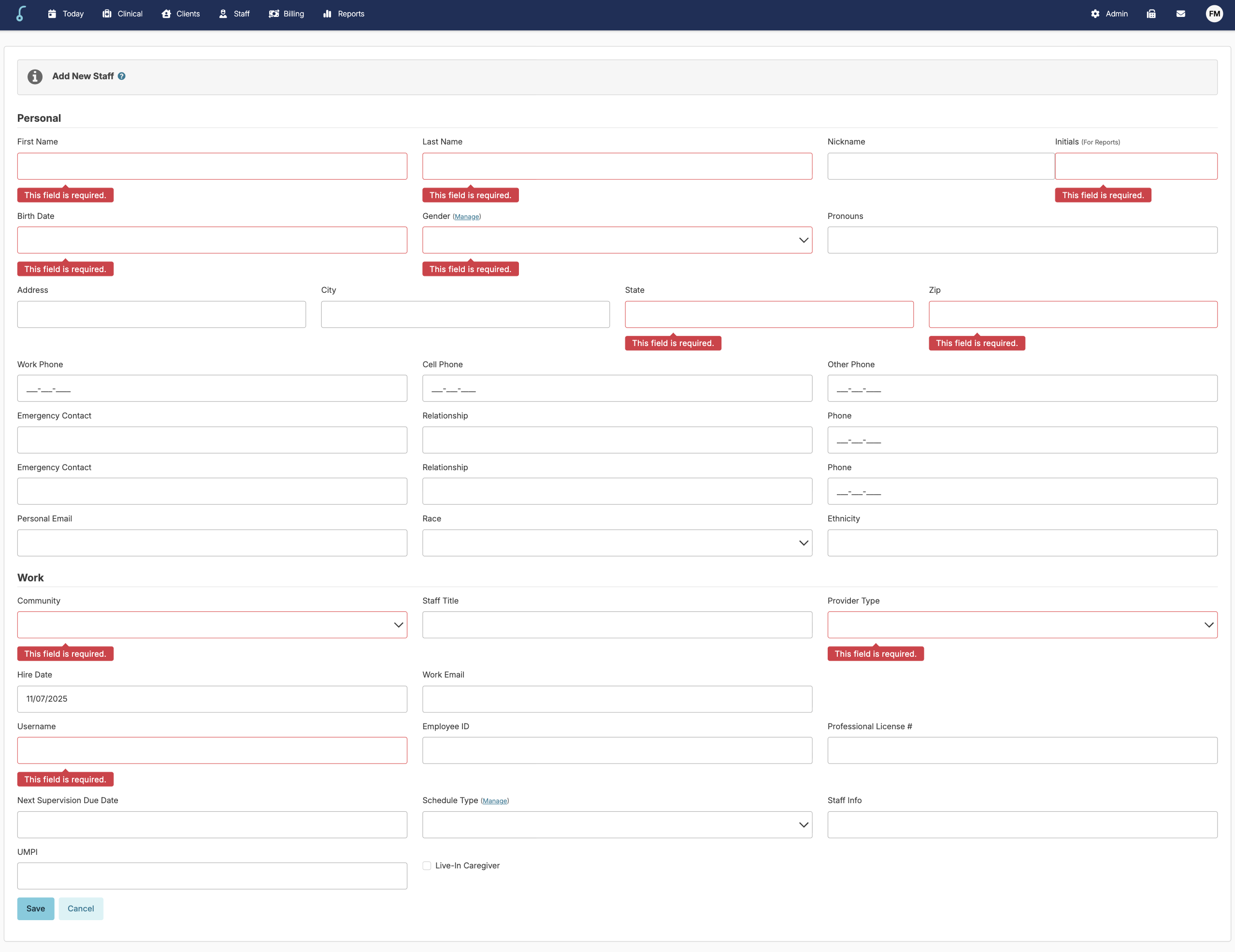 📘 If you try to save a staff profile and are missing information, the fields will be flagged. Enter the missing information and press Save again.