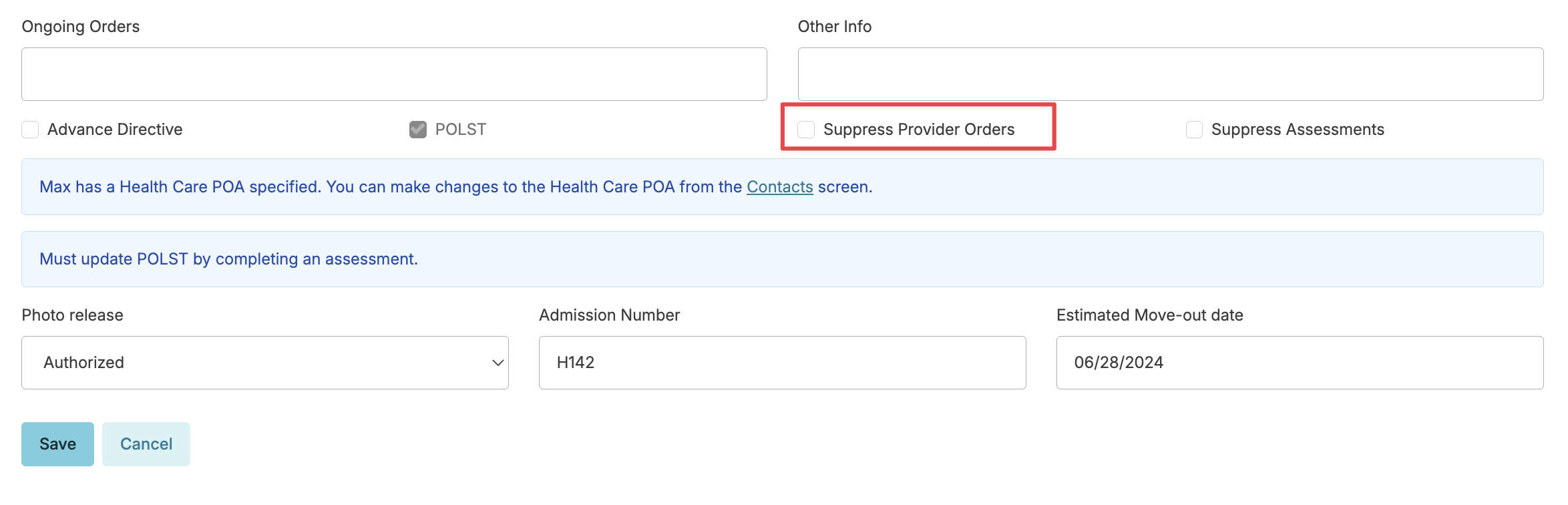 - Suppressing provider orders is an option in the resident profile that simply prevents you from receiving notifications of provider orders. This action can be updated at whatever point the resident requires nursing care, providing those notifications to you once again.