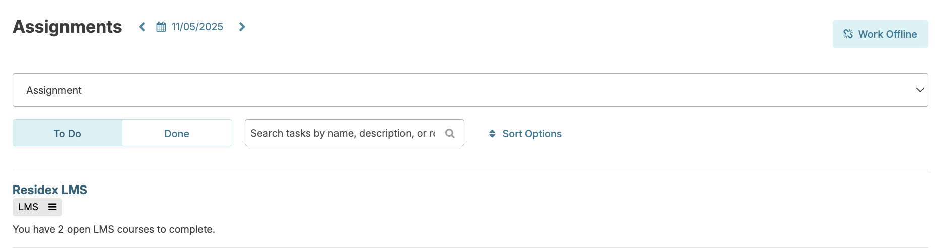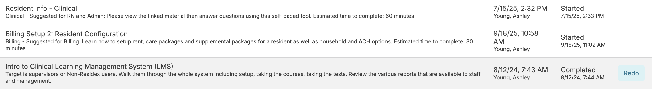 Residex learning management system includes a series of videos and support documents that can be assigned to staff on the Residex Today > Assignments screen. Videos are broken into short segments that are easily viewed. Questions asked after viewing the video are designed to highlight key points; incorrect answers simply re-explain and guide the staff person to the correct answer. Reports are available showing staff trainings completed and those assigned but not yet completed.