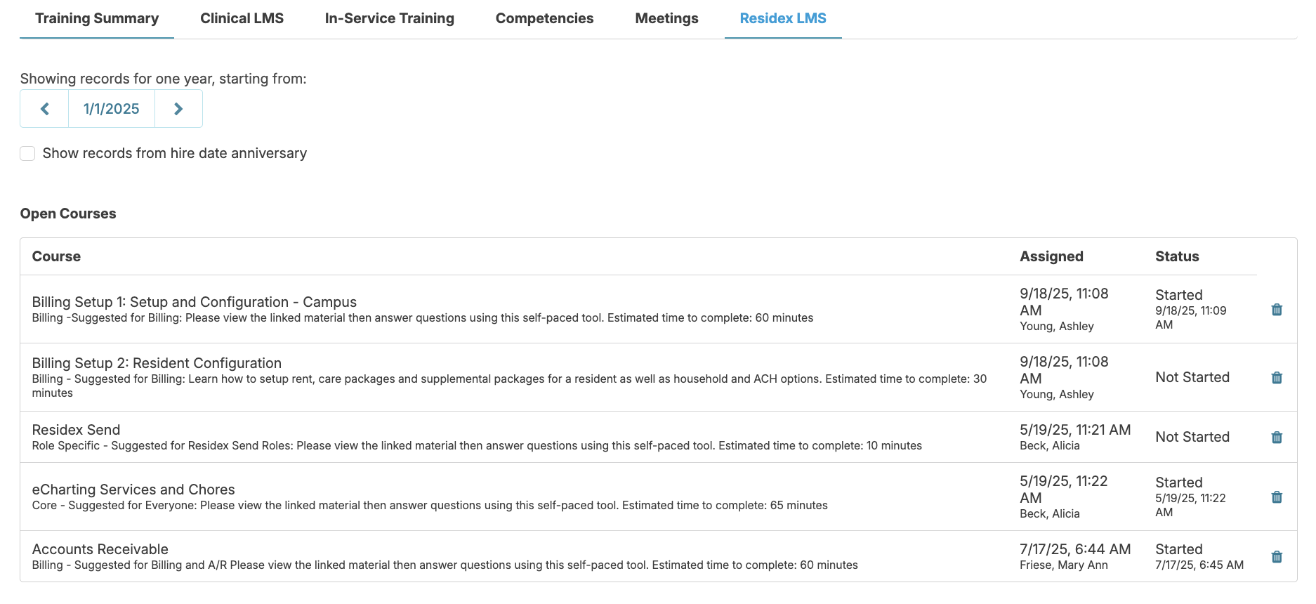 You can delete courses assigned in error by navigating to Staff > Staff > staff profile > Training > select the Residex LMS tab > scroll to 'Open Courses' > click the blue trash can to the right of the course you wish to delete.