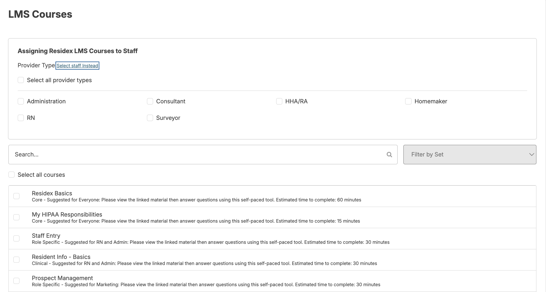 One or multiple courses can be assigned to one or more staff by navigating to Staff > Assign LMS Courses. Click on the course(s) that you wish to assign > select staff by name or provider type > click Save.