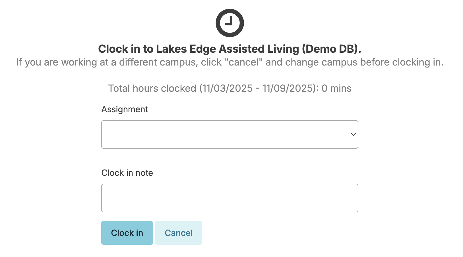 • Staff choose their assignment, add an optional clock-in note, then select Clock in
