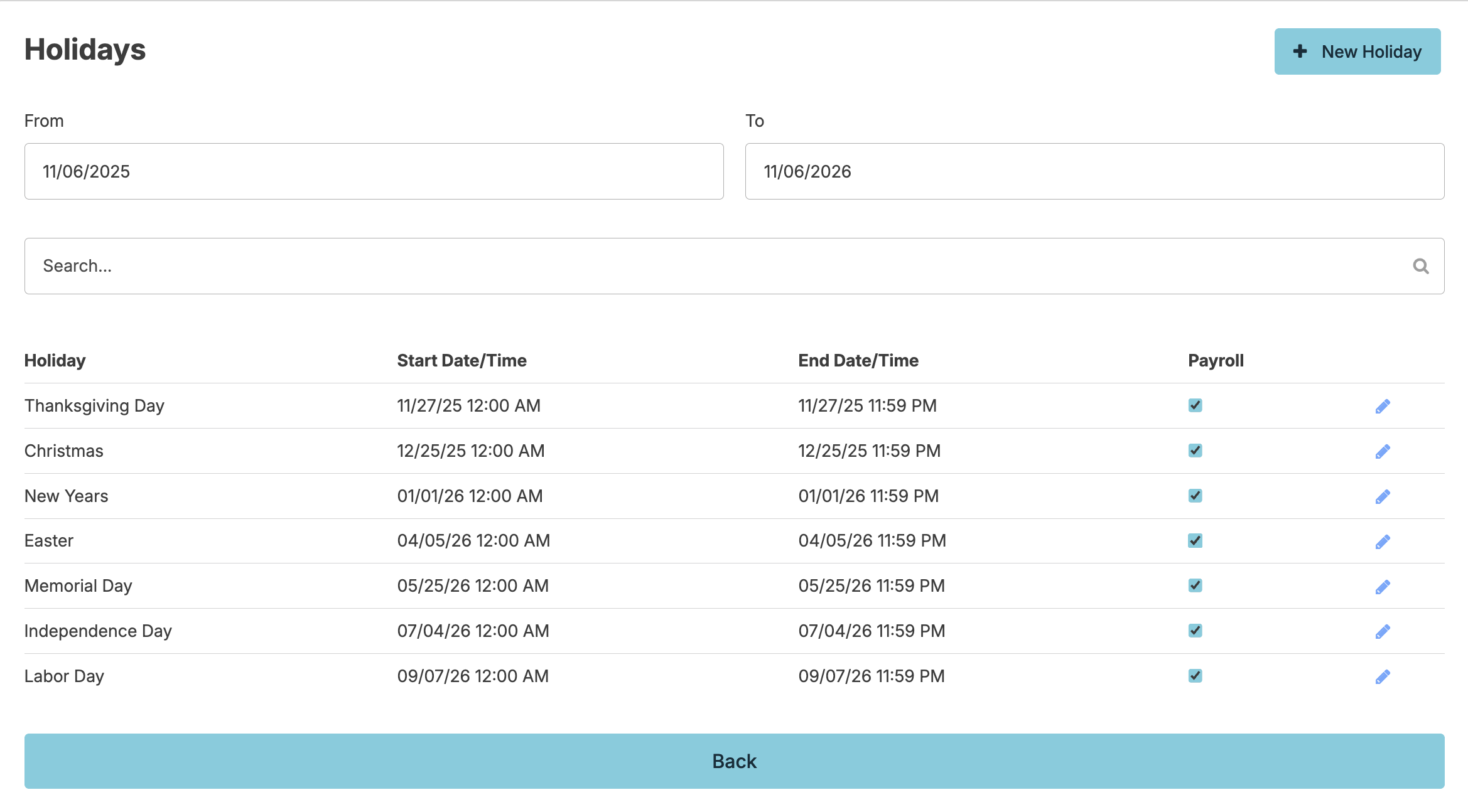 Holidays can be managed by navigating to Admin > Holidays. Here you will be able to edit the holiday name, start date, end date, start time, and end time. You can also indicate whether that holiday is counted in your payroll. If there are other holidays that you would like to add to your list, this can be done by clicking the + New Holiday button, entering the holiday details, and clicking save.