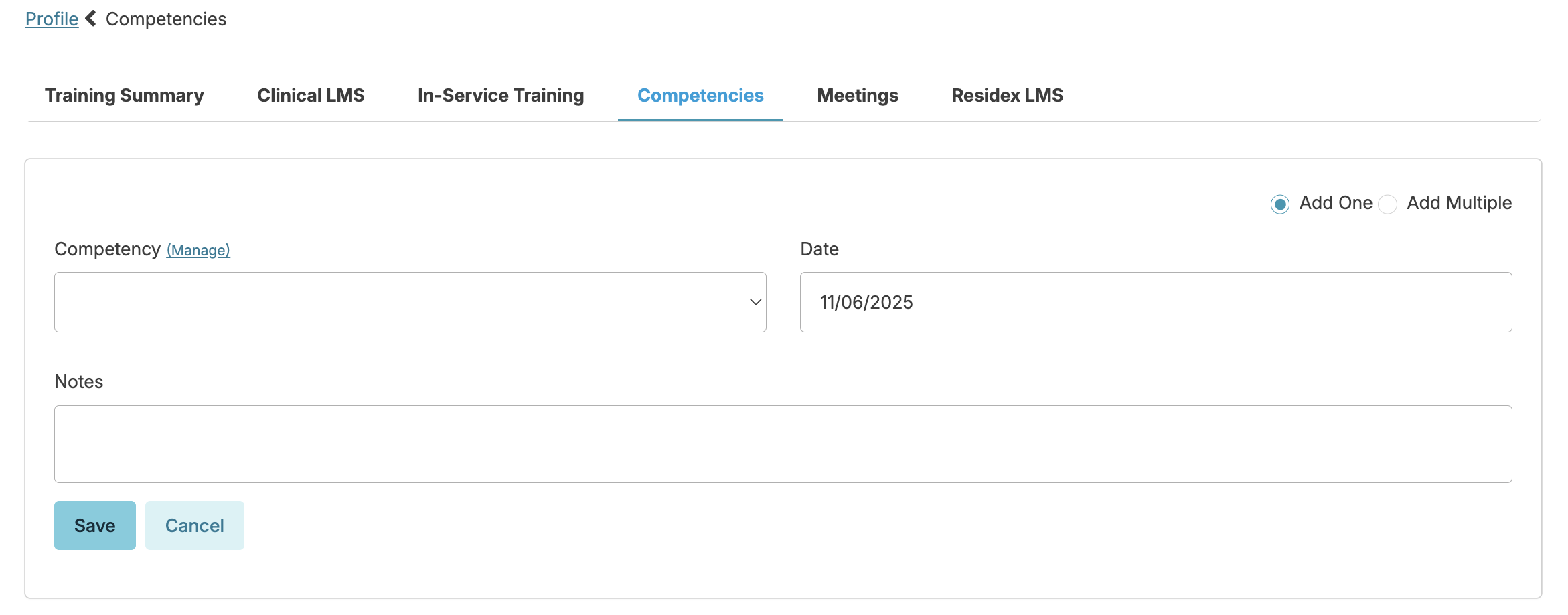 To add more than one competency at a given time for a single staff person, from the staff profile > Training > Competencies > Add Competency > toggle the Add Multiple competencies option.