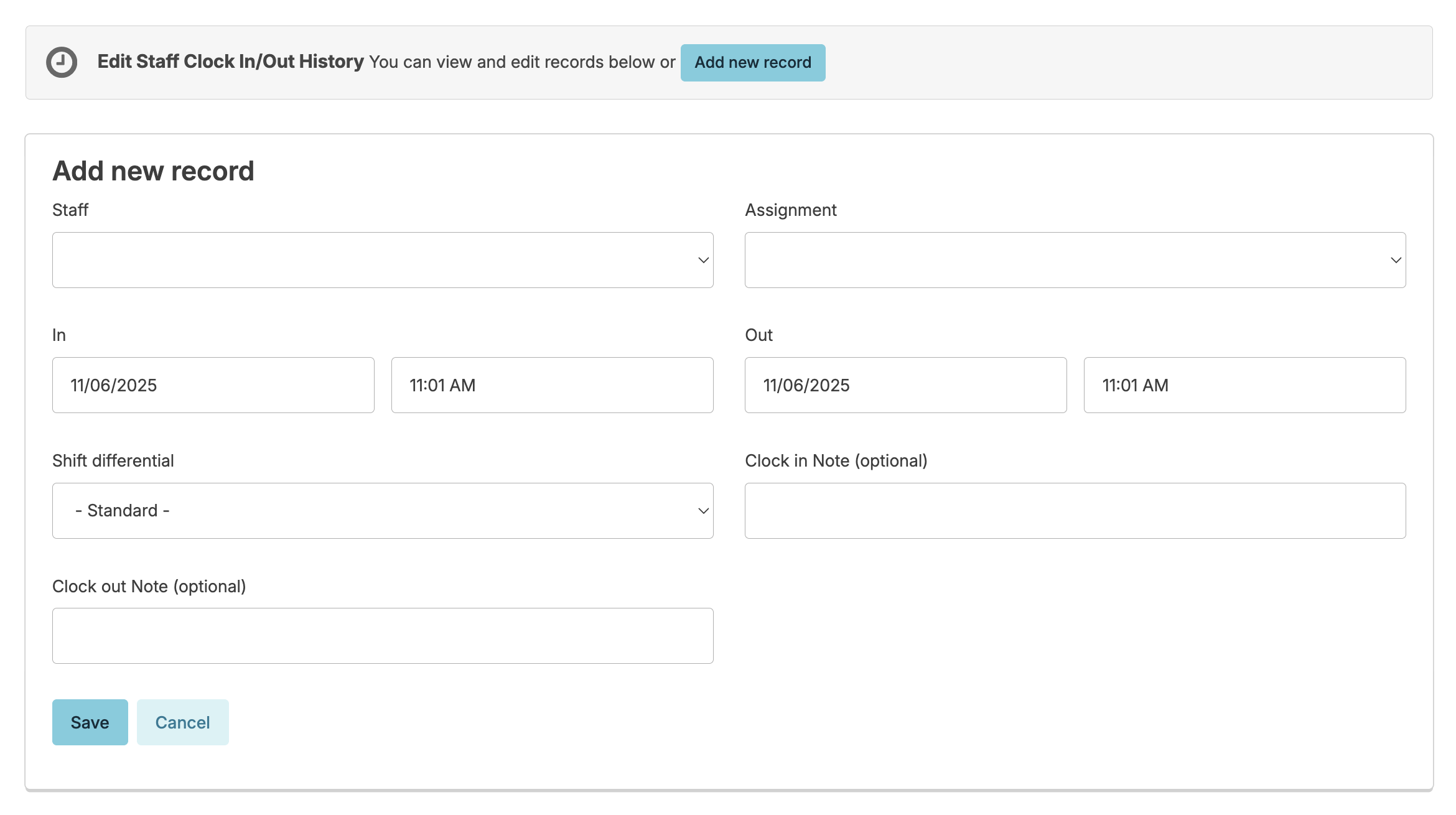 • Click Add new record at the top of the time clock history screen