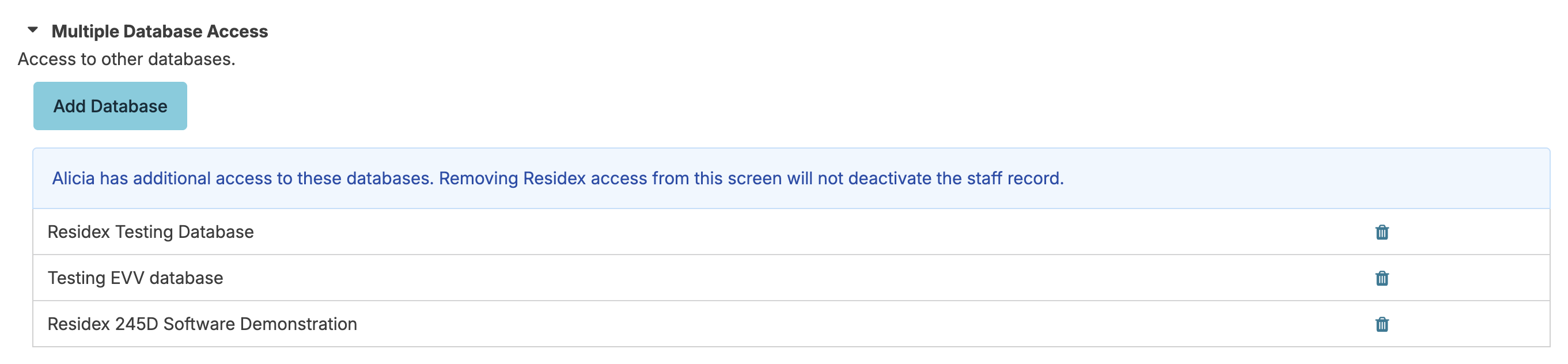From the Database where the staff person is entered AND active, navigate to their staff profile > Security > Multi-Database Access. You will see a dropdown that displays the databases you as an administrator have access to. Select the database you wish to give the staff access to and save. This process will add that staff record to the new database with the same roles as the current database with the exception of Administrator (Role 411), Administrator Assistant (Role 410), and Emergency Downloads (Role 911) which must be added manually.