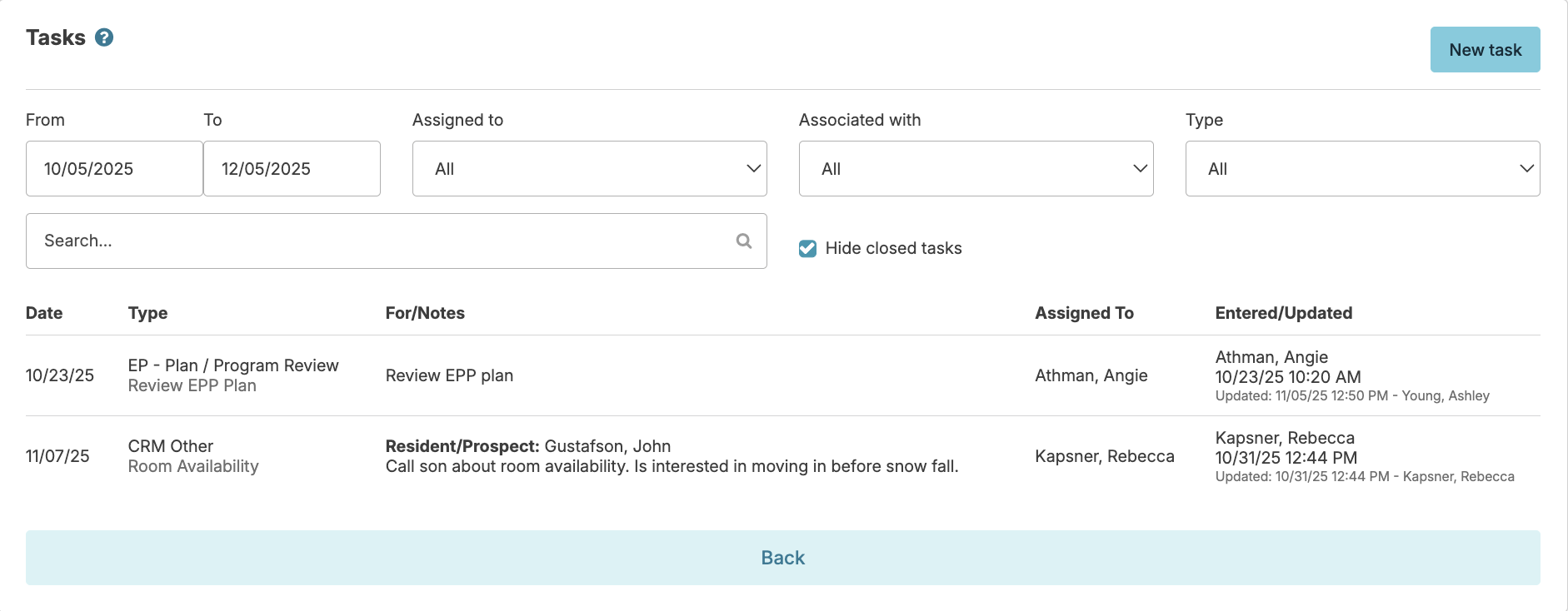 - Tasks associated with a contact will also appear as a task for the related resident or prospect.