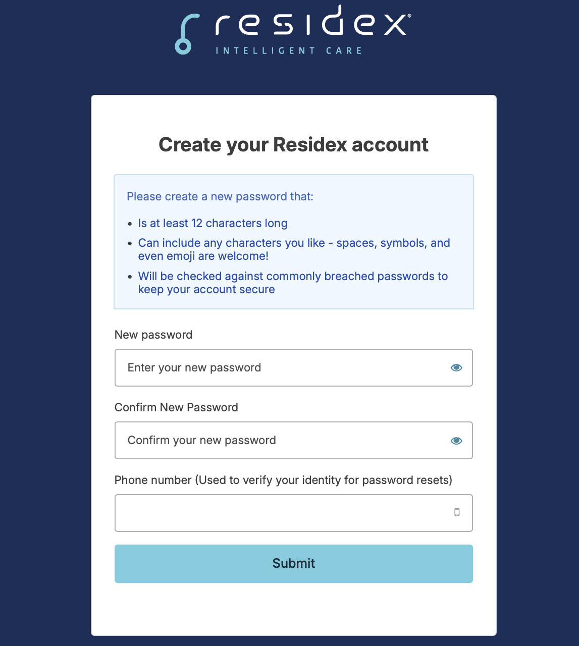 • We recommend you do not use the same password for your Residex account that you use with any of your other accounts