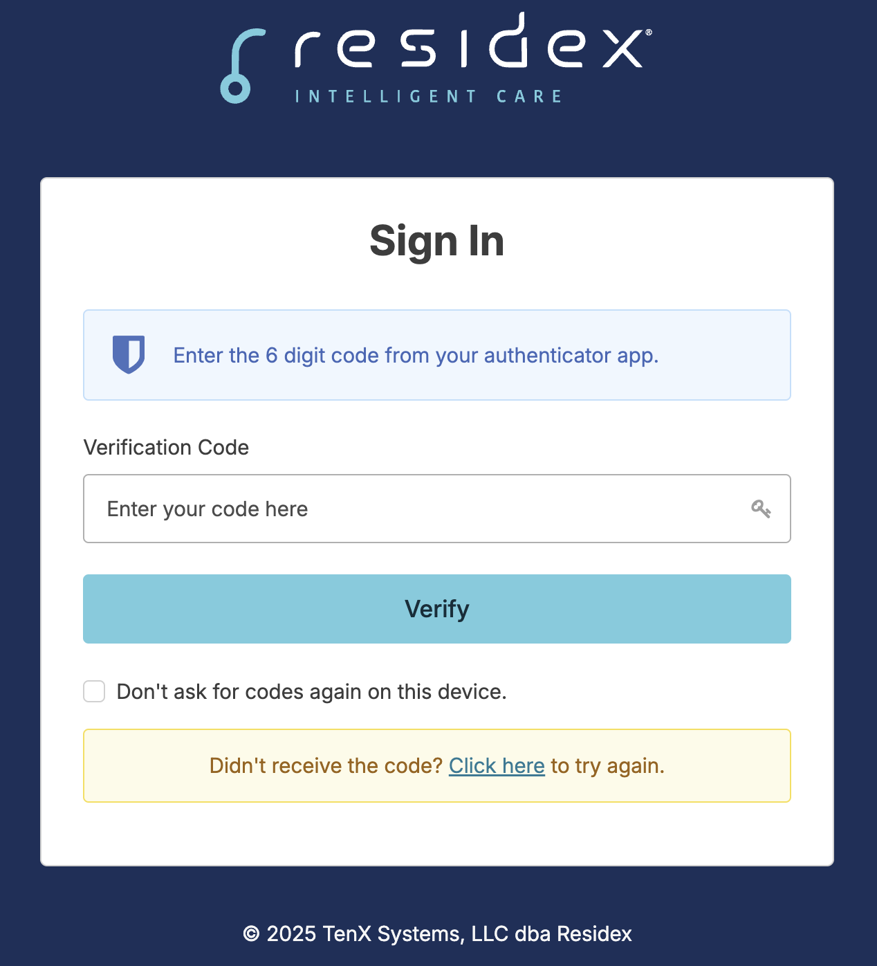 When logging in on a new device, you’ll need to complete two-factor authentication. If you use an authenticator app, enter the code displayed there. If you’ve chosen SMS verification, you’ll receive a text message with a one-time code. Enter the code when prompted by Residex to complete your login.